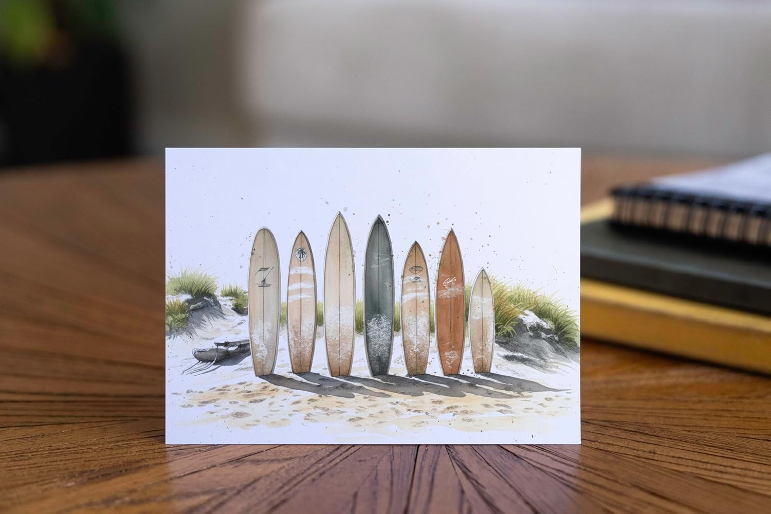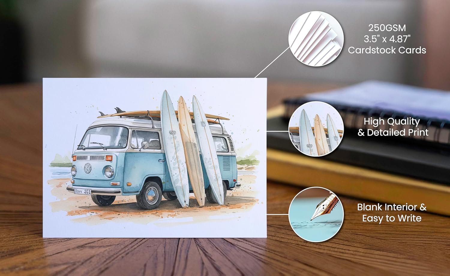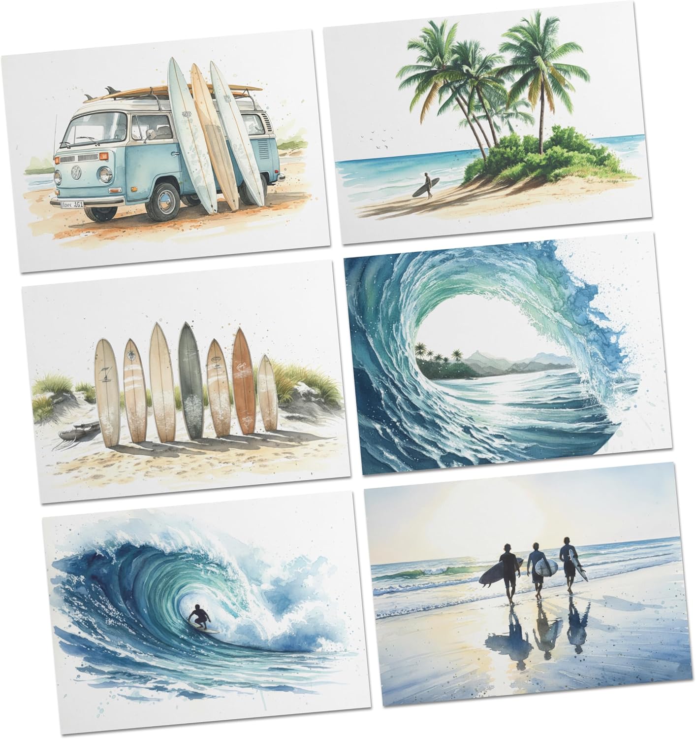 Beautiful Watercolor Surf Art – Each card features a unique ocean-inspired design: a classic surf van, palm-tree beach scene, surfboards in the sand, and dynamic wave illustrations—including a barrel wave and surfer-in-action design. Perfect for surfers and beach lovers alike.